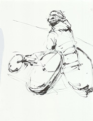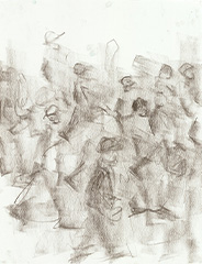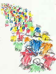 東京都庁前からスタートして走り出すランナー達を東京藝術大学の学生が約30分間の限られた時間でクロッキーし、作品を展示します。それぞれの42.195㎞がはじまるランナー達の身体活動や心の動きを藝大生たちの集中力・想像力で捉え、描きます。