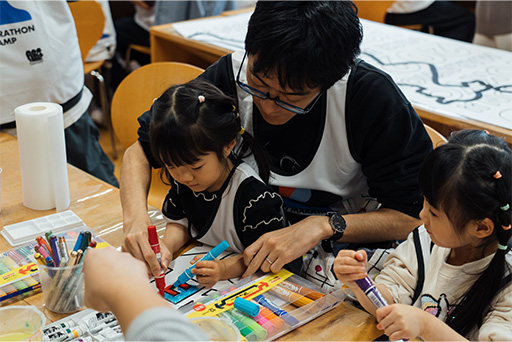 お子様から大人まで皆さんで描いたカラフルな色でランナーの走りを応援します!