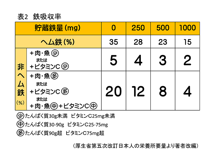鉄の吸収率は体内に貯蔵されている鉄の量(貯蔵鉄量)によって異なり、貯蔵鉄が多ければ吸収率は低く、少ないと吸収率が高まります。これは生体が体内鉄の量を厳密にコントロールしている証です。鉄のうちヘム鉄の吸収率はこの貯蔵鉄量の影響だけで変化しますが、非ヘム鉄は貯蔵鉄量のみならず、食べ合わせの影響も受けます。表2は体内貯蔵鉄量による鉄吸収率のちがいと、同時摂取する食品による鉄吸収率のちがいを示しています。この表の通り、たんぱく質とビタミンCとを同時摂取することで非ヘム鉄の吸収率が増加することがわかります。よって、非ヘム鉄を多く含む小松菜、ほうれん草、がんもどき、高野豆腐などはたんぱく質の多い料理やビタミンCの多い食品と合わせて食べるようにするとよいでしょう(図2)。なお、非ヘム鉄とたんぱく質・ビタミンCとを別のタイミングで摂取しても鉄吸収率は増加しないこともわかっています。1回の食事で合わせてとるようにしましょう。