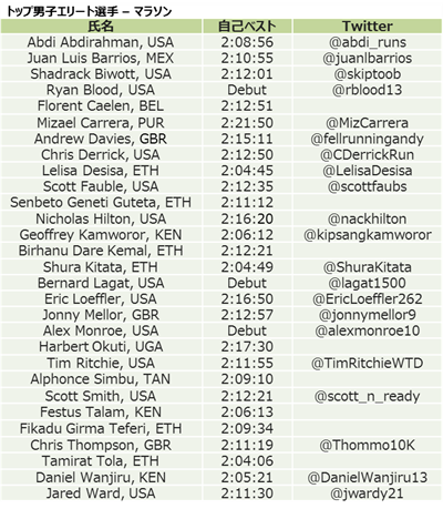 既に出場が発表されているディフェンディングチャンピオンのジェフリー・ カムウォロレとマルセル・フグに加え、男子マラソンにはオリンピアン9名、男子車いすマラソンにはパラリンピアン14名が出場します。