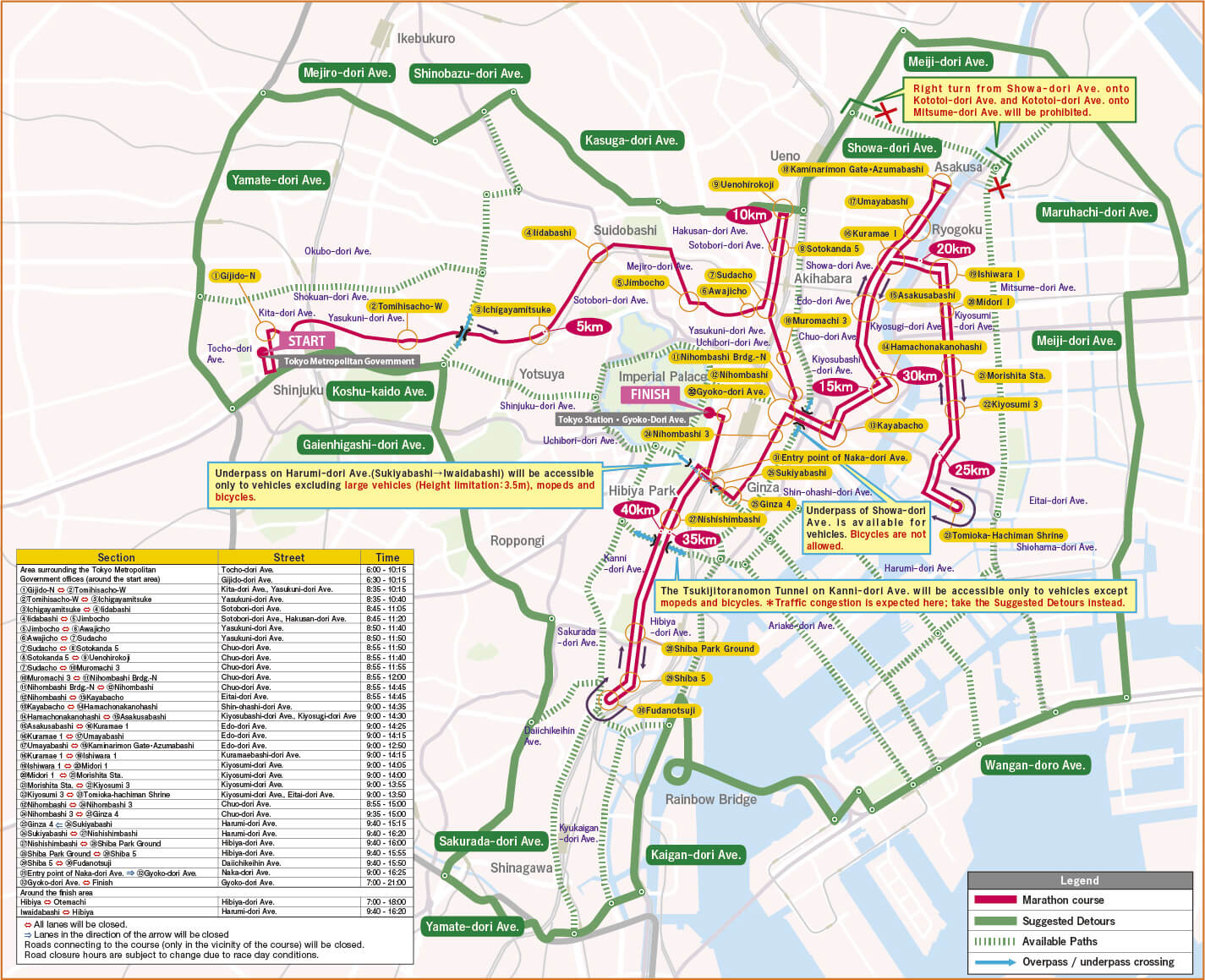 ・Crossing across the course will also be regulated for pedestrians and cyclists. Please use pedestrian overpasses or underpasses wherever possible.