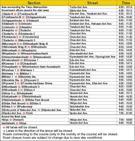 ・The roads around the course will be closed for a long period of time. Follow detour instructions from police officers or marathon staff on site.