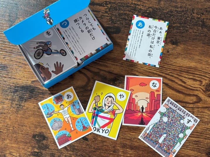 Tokyo Marathon Karuta is an original "karuta" card game with a Tokyo Marathon theme. It contains 46 cards featuring Tokyo Marathon insights and observations, highlights, and relatable anecdotes submitted by the marathon's numerous runners, volunteers, and marathon fans.